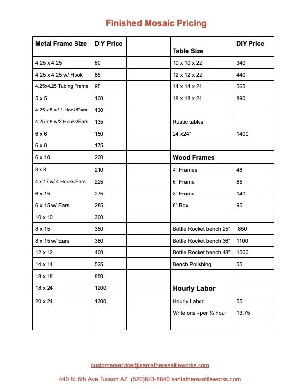 Come create a mosaic bench, table or frame anytime we are open, no appointment necessary! Schedule a private group for a mosaic making workshop on a weekend or evening - perfect for team building or birthday parties. Or learn to make your own tiles in our Intensive Tile Making Class taught by our artists, all materials included. Santa Theresa also offers workspace, materials, and firings to experienced tile artists – just ask our staff for details. Don’t see a workshop that fits in your schedule? Stop by any time our showroom is open to make a mosaic!